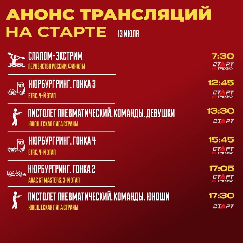 ☀️ Знакомьтесь с расписанием трансляций на день Большое количество спорта в наших эфирах даже летом. Начнем со слалома, а дальше в программе – стрельба и автоспорт. Что планируете посмотреть сегодня? 😏 🛒 Наше приложение в Google Play 💙 Наше приложение в RuStore 🛒 Наше приложение в App Store
