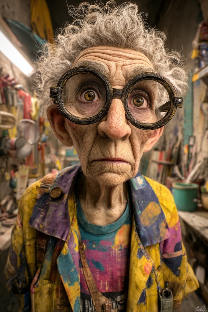 ultraphotorealistic character portrait, style of a character from a Coen Brothers film, a wiry and quick-moving elderly woman, the owner of a basement tailor shop called "Repair of Everything". She is wearing an old men's shirt over a colorful t-shirt, her clothes are a palette of her life with spots of paint and oil. Her signature features are her hands, covered in small scars and calluses, and her huge, round horn-rimmed glasses, one lens cracked and taped with a plaster, constantly slipping down her nose. Her look is attentive and studying. Shot on a Canon 5D Mark IV with a 85mm f/1.2 lens, shallow depth of field, cluttered workshop background, natural overcast lighting, extreme detail. --ar 2:3 --s 150 - - v 6.0 👇