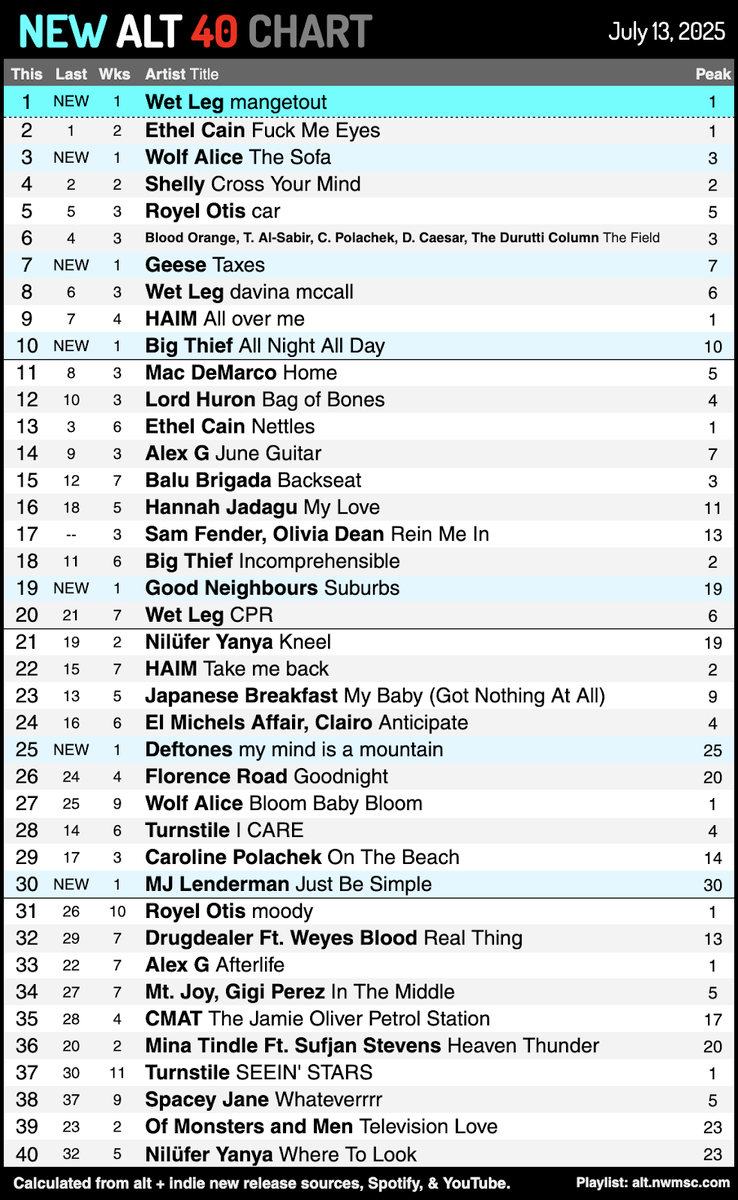 WOLF ALICE, GEESE, BIG THIEF, GOOD NEIGHBOURS также дебютировали новыми синглами в первой половине чарта.