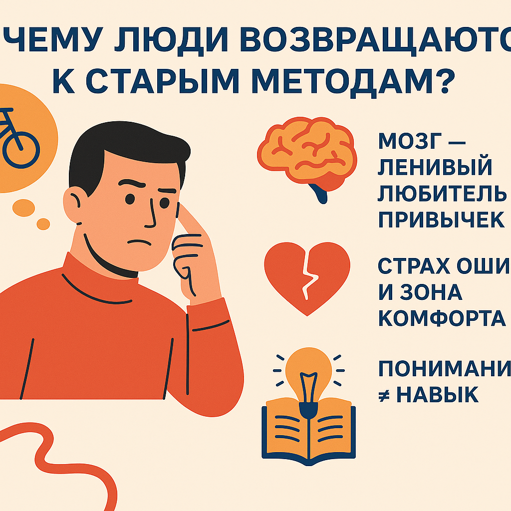 Вы объяснили другу, как решать задачу новым, крутым способом. Он кивает, говорит: «А, понял, гениально!» — а потом… снова решает по-старому. Знакомо? Давайте разберёмся, почему так происходит и как это исправить. Человеческий мозг — мастер экономии энергии. Старый метод, даже если он медленный или неэффективный, уже протоптал в голове нейронную «тропинку». Это как идти по знакомой дороге: не надо думать, просто шагаешь. Новый способ, хоть и лучше, требует усилий — мозгу нужно прокладывать новую трассу. Поэтому он часто «саботирует» и возвращается к привычному. Пример: Ученик выучил, как решать квадратное уравнение через дискриминант. Но под стрессом на контрольной он всё равно пытается подобрать корни методом тыка, потому что так делал раньше. Новое пугает. Даже если человек понял, как работает новый метод, он может бояться: «А вдруг я запутаюсь?» или «А что, если этот способ не для всех задач?» Старый подход кажется надёжным, как старый велосипед: может, и скрипит, но точно доед