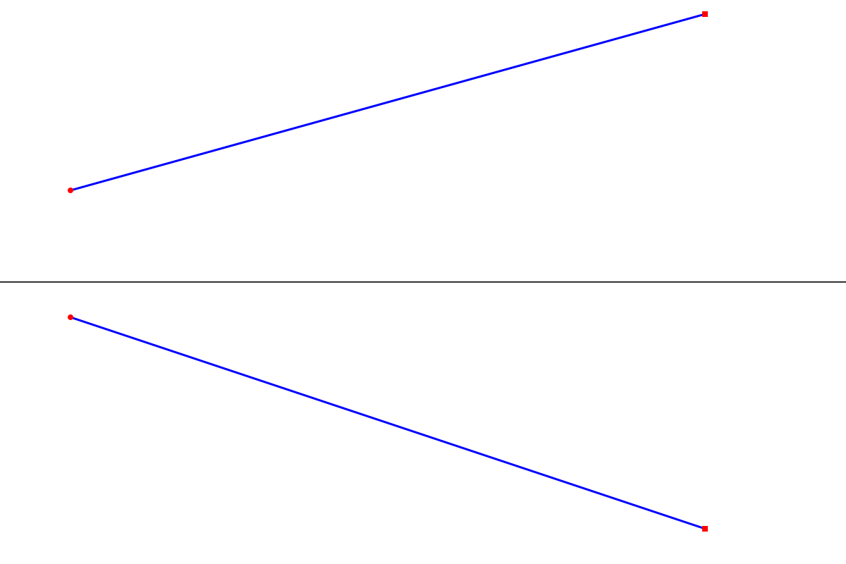 Перед нами эпюр Монжа с фронтальной и горизонтальной проекцией синего отрезка. Точки, ограничивающие отрезок, я буду обозначать различными образами: кружками, квадратиками, звездочками, треугольниками, крестиками и т.д. Такой подход позволит отказаться от буквенно-цифрового обозначения точек.