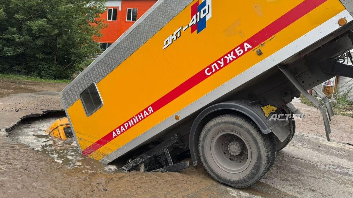 КамАЗ аварийной службы провалился в огромную яму в Новосибирске