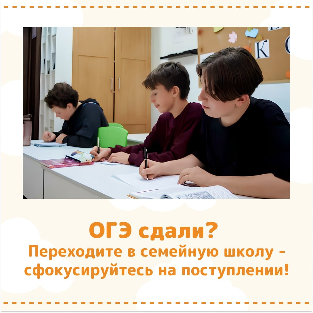 ОГЭ сдали? Переходите в семейную школу - сфокусируйтесь на поступлении! Переход в семейную школу в старших классах — это возможность: ✔️ Учиться в комфортном ритме без стресса и перегрузок ✔️ Сфокусироваться на ЕГЭ и нужных профильных предметах ✔️ Получить индивидуальную поддержку от педагогов ✔️ Гибко совмещать учебу с интересами и развитием личных качеств Что мы предлагаем? ✅ Очная семейная школа + заочная частная — гибкий и эффективный формат. ✅ Маленькие группы ✅ Поддерживающая атмосфера — мотивация без давления ✅ Развитие soft skills: коммуникация, работа в команде, креативность, эмоциональный интеллект, тайм-менеджмент и др. ✅ Можем делать упор на нужные предметы: 🔸 Иностранные языки 🔸 Историю и литературу 🔸 Математику Рассмотрим другие направления подготовки по запросу. Адрес: Семейный центр «Ученый кот» м. Бабушкинская, ул. Искры, 9 корп.2 Как перейти к нам в 10 класс? Условия поступления: 1️⃣ Положительные результаты ОГЭ по 4 предметам 2️⃣ Собеседование с учеником и сем