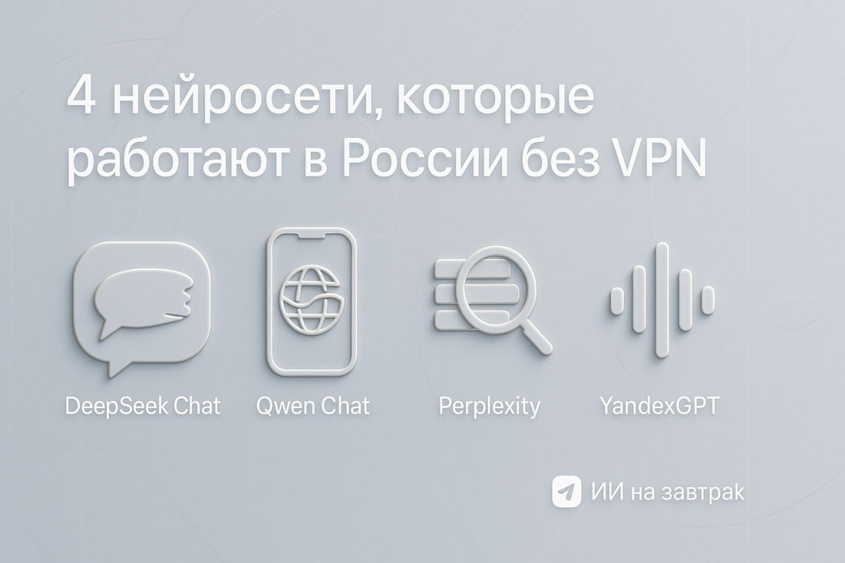 🔓 4 нейросети, которые работают в России без VPN (проверено лично — всё по-честному) Никаких обходов, никаких установок — просто открыл в браузере и начал пользоваться. Вот 4 ИИ, которые точно работают без VPN в РФ года: 1. DeepSeek Chat 🧠 Китайская альтернатива ChatGPT ✅ Бесплатный, безлимитный ✅ Генерирует текст и изображения ✅ Есть мобильные приложения 🔗 (https://chat.deepseek.com) 💡 Совет: Входи через Google — быстро и без лишнего. 2. Qwen Chat от Alibaba 🤖 Мощная модель с поддержкой русского языка ✅ Пишет тексты, создаёт картинки и видео ✅ Работает быстро, без регистрации 🔗 (https://chat.qwen.ai) 💡 Фишка: Добавь сайт на главный экран смартфона — будет как приложение. 3. Perplexity AI 📚 Умнее Google: ищет и даёт ссылки на источники ✅ Быстро отвечает, без VPN ✅ Отлично подходит для поиска и анализа 🔗 (https://www.perplexity.ai) 💡 Совет: Идеально для студентов, копирайтеров и ленивых гуглеров. 4. YandexGPT (через Алису, Shedevrum или Облако) 🇷🇺 Российская нейросе