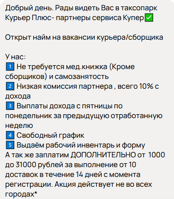 GRAND - Работа в Купере - предоставляет именно такую возможность, у него слоты можно выбирать по часу. Но, на этом его преимущества заканчиваются. Дальше одни недостатки. Приложение, которое вам он предложит скачать, трубет постоянного интернета. В Москве, может быть, сотовая связь работает штатно, но стоит вам отъехать от Москвы в какую-нибудь Владимирскую область, так мобильный интернет внезапно пропадает, а , иной раз, и сама связь вовсе. Причина плохой работы мобильной связи: власти решили отключать связи, якобы, им это очень помогает бороться от прилетов украинских дронов. На самом деле, дроны используются как повод нарушать права граждан, отключение мобильной связи (значительное ухудшение качества связи) без предупреждения законно лишь при введении военного