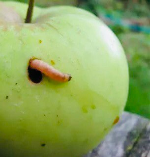 Настоящая угроза – гусеница. Именно она та самая "червоточина". Сначала она светло-розовая с темной головой, по мере роста становится розовато-красной, достигая 1,5-2 см. Жизненный цикл плодожорки тесно связан с развитием яблони и температурой воздуха. Зимуют взрослые гусеницы в плотных шелковистых коконах под отставшей корой на стволах и скелетных ветвях, в трещинах подпор, в таре для хранения урожая, иногда в верхнем слое почвы у корневой шейки.