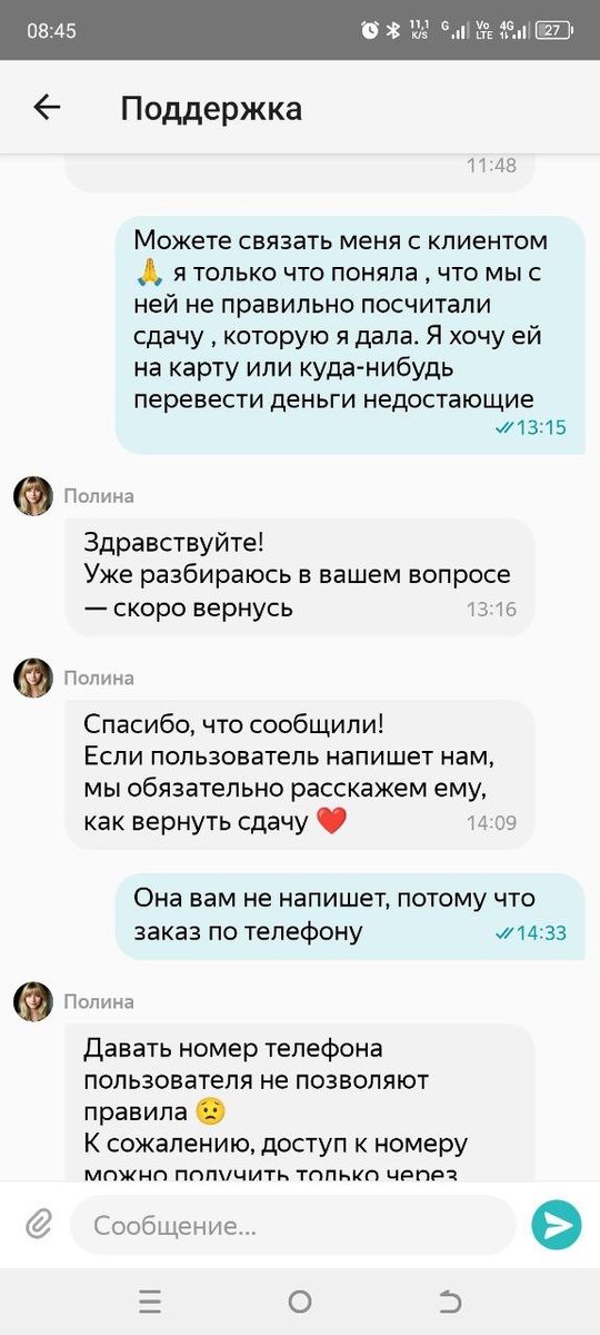 Коротко о супер клиентоориентированности Яшиных ботов ) 😁 Печально и грустно , совсем никак не хотела обманывать женщину, просто переработала и мозги кипели... Но я сделала все что могла 💔 100 рублей ей не отдала получается 😖