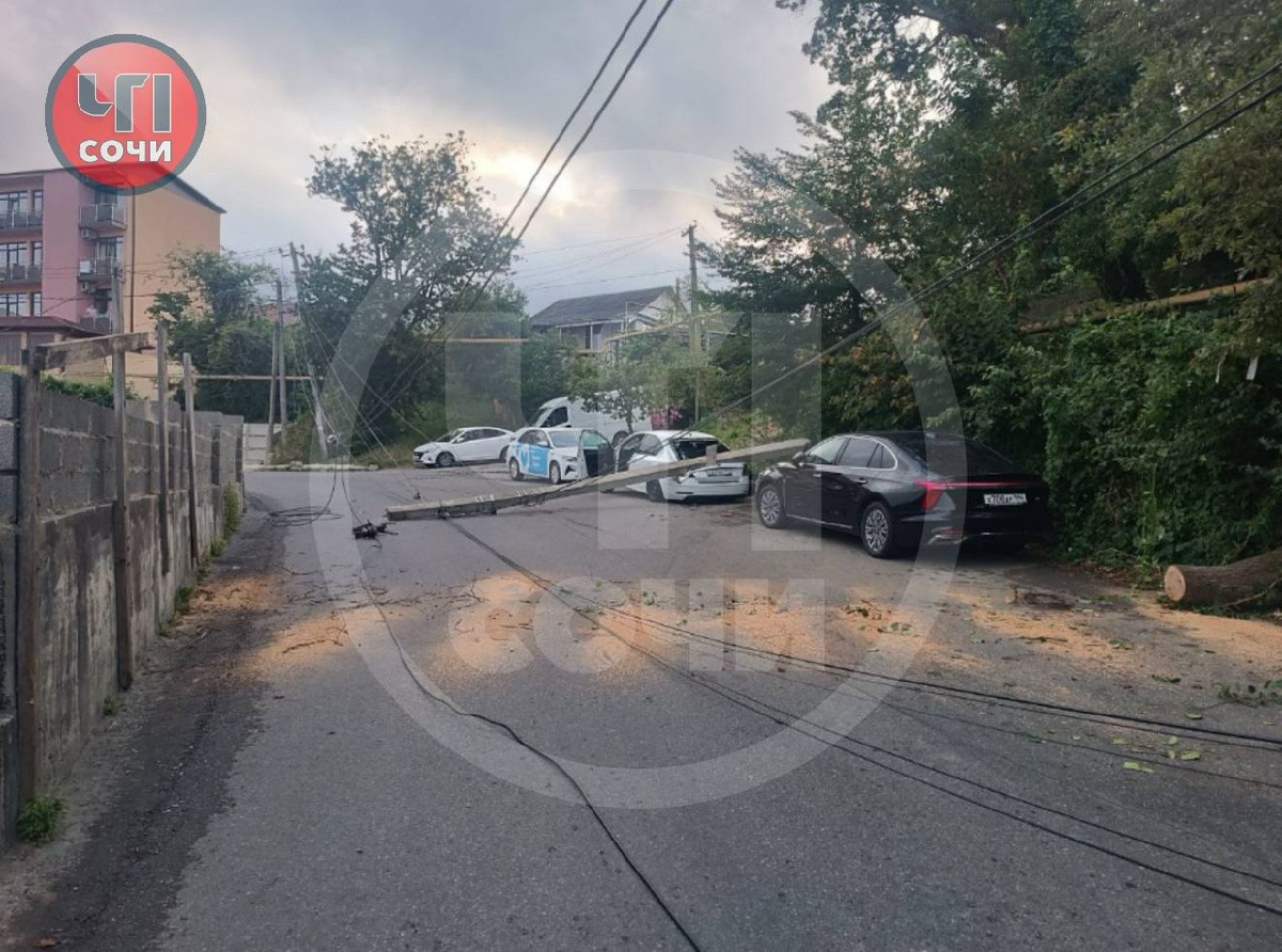 В Сочи упавшее дерево оборвало провода и повалило столб на машину