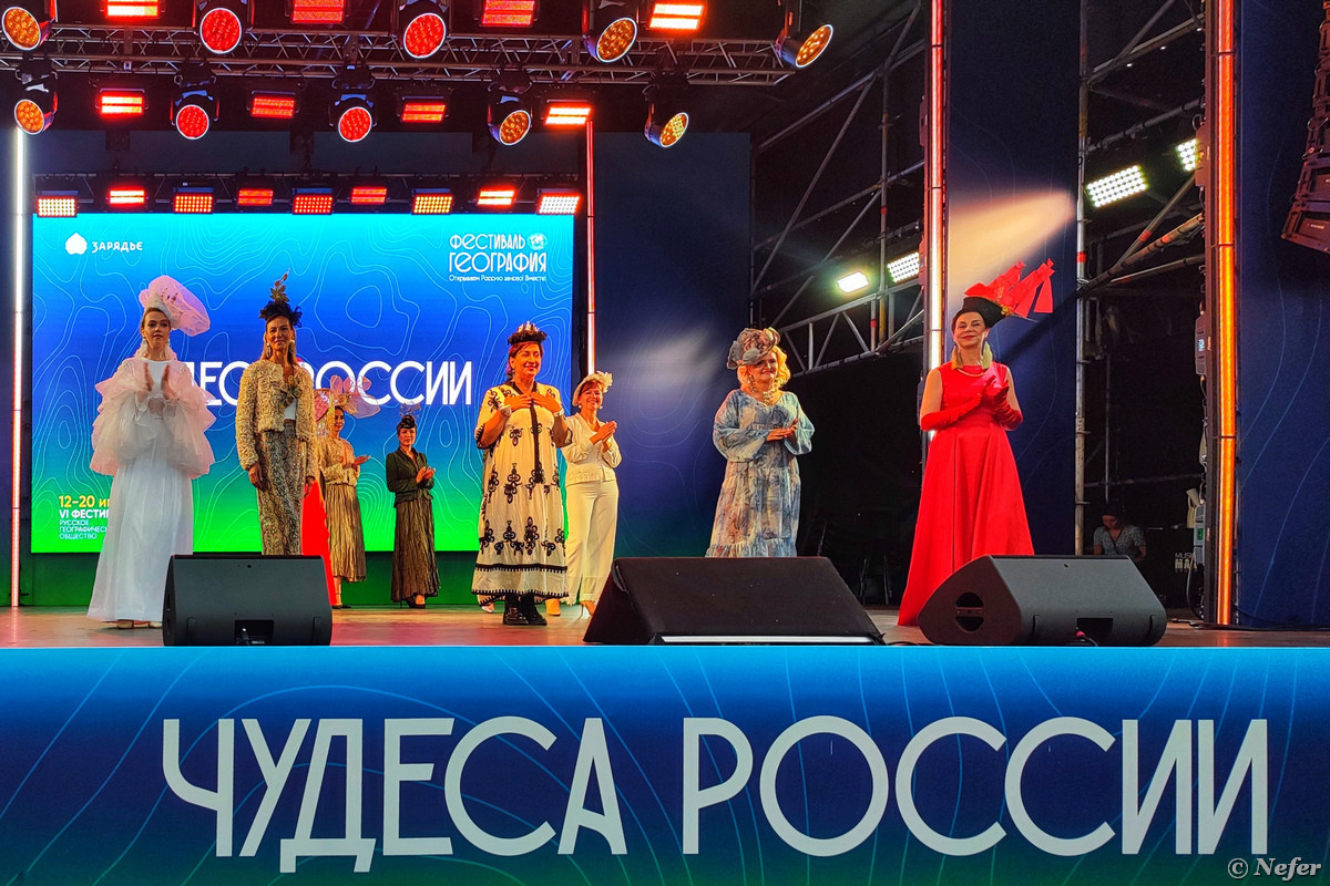 Вчера начался фестиваль Русского Географического Общества. Дело было в парке Зарядье. Рекламируют красоты России, куда можно съездить и где что посмотреть. Видела павильон, продвигающий БУТ - Большая Уральская Тропа, надо изучить, что это такое. В течение дня проводятся выступления и модные показы региональных дизайнеров. Главная сцена расположена ближе к Кремлю, где мост, рядом с павильоном-сферой. На малой сцене отдельная программа. Параллельно что-то происходит в Медиацентре и в Заповедном посольстве, но я туда не ходила. Мне были интересны конкретные участники, ну и остальное посмотрела заодно. Немного поснимала видео. Над Кремлем висела черная туча. Но так как была жара, никто в нее не верил. Она сверкала, гремела и всячески устрашала. Но мы смотрели концерт. А потом ка-ак ливануло! У меня хоть зонтик был, правда сухой осталась только голова. Мы с народом забились под дерево, сзади была стена сцены. Честно говоря, не поняла, почему я оказалась ВСЯ мокрая. Крепдешиновое платье обл