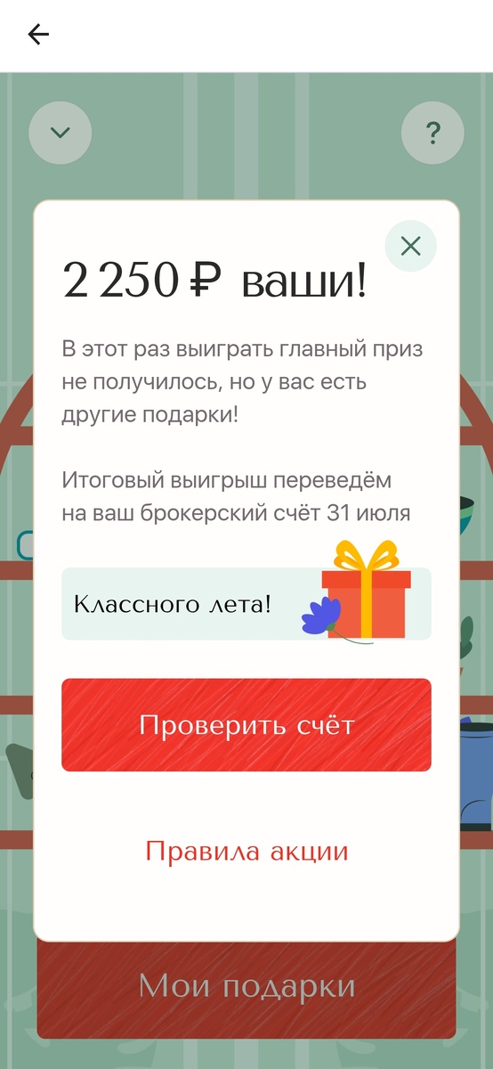 Добрый день, друзья! 11 июля был розыгрыш главного приза в игре 10 недель до лета от Альфа банка. Нужно было еженедельно совершать сделки от 1000₽ для получения гарантированных призов. Начала я участвовать с самого начала, но на одном из этапов, из-за праздничных дней, результат у меня обнулился. Поэтому мой прогресс начался с 4-го этапа. Тем не менее гарантированный приз я заслужила. В розыгрыше главных призов, к сожалению, не выиграла. Но гарантированный приз в 2250₽ заработала. Мелочь, но приятно. Начислят приз 31 июля. До этого выиграла в Алхимии Акций 900₽, тоже не лишние. Кто участвовал в 10 недель лета, можете тоже посмотреть сколько вам начислят. Поздравляю тех, кто выиграл главные призы🥳
