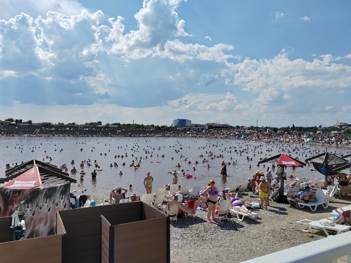 Так как я купальщица, а моя коллега загоральщица, то я сразу пошла в озеро, а она загорать. Спустя часа полтора бахнул сильнейший ливень. Все люди стали убегать, побросали шезлонги. Я осталась в озере и получила еще и порцию массажа от капель дождя. А коллега заняла хороший лежак и просто наслаждалась летним дождем. За время пребывания коллега покупала порезанный арбуз в пластиковым пол-литровом стакане-цена 200 рублей.