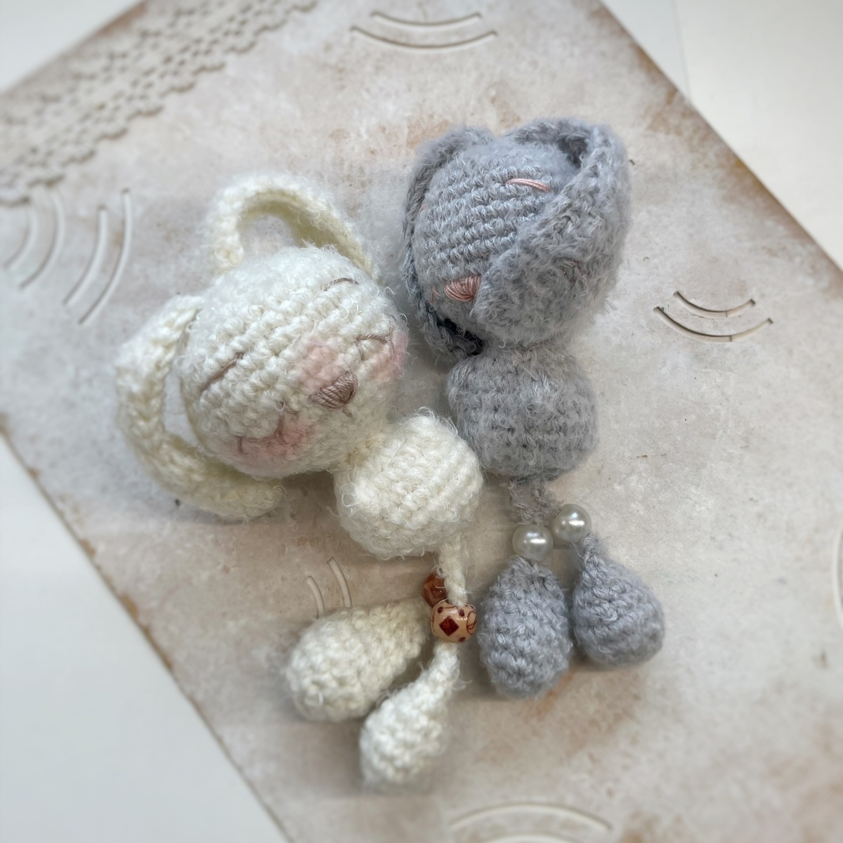 Видео-урок - 2 часа, запись прямого эфира + схема Материалы: - Пряжа (Семеновская HIT MAX, 590 метров в 100 гр) - 6 гр (100% хлопок) - Alize kid mohair - 3 гр (для пушистости) Вяжем в 2 ниточки Семеновская+Ализе. - Крючок 1,25 мм (1,5/1,75) Игрушка получается размером около 10 см (без учета ушек) - Наполнитель - синтепух - 4гр -Ниточки для вышивания мордочки и игла, деревянные бусинки (4мм) для украшения ножек, сухая/масляная пастель для тонировки щечек. Карабин для брелка. Условные обозначения: — КА - кольцо амигуруми - пр - прибавка - уб - убавка - ш - шишечка из 4 ссн с одной вершиной (шишечкой связаны 2 верхние лапки и хвостик, видео как вязать шишечку я прикреплю) - сбн - столбик без накида - пссн - полустолбик с накидом —ссн - столбик с накидом - сс - соединительный столбик - в.п. - воздушная петля - (N, N)*N - повторить комбинацию заданное количество раз. Вяжем нижние лапки (2 детали): 1. 6 КА 2. 6 пр (12) 3. 2 сбн, 2 пр, 4 сбн, 2 пр, 2 сбн (16) 4. 16 сбн (Немножко набиваем лапк