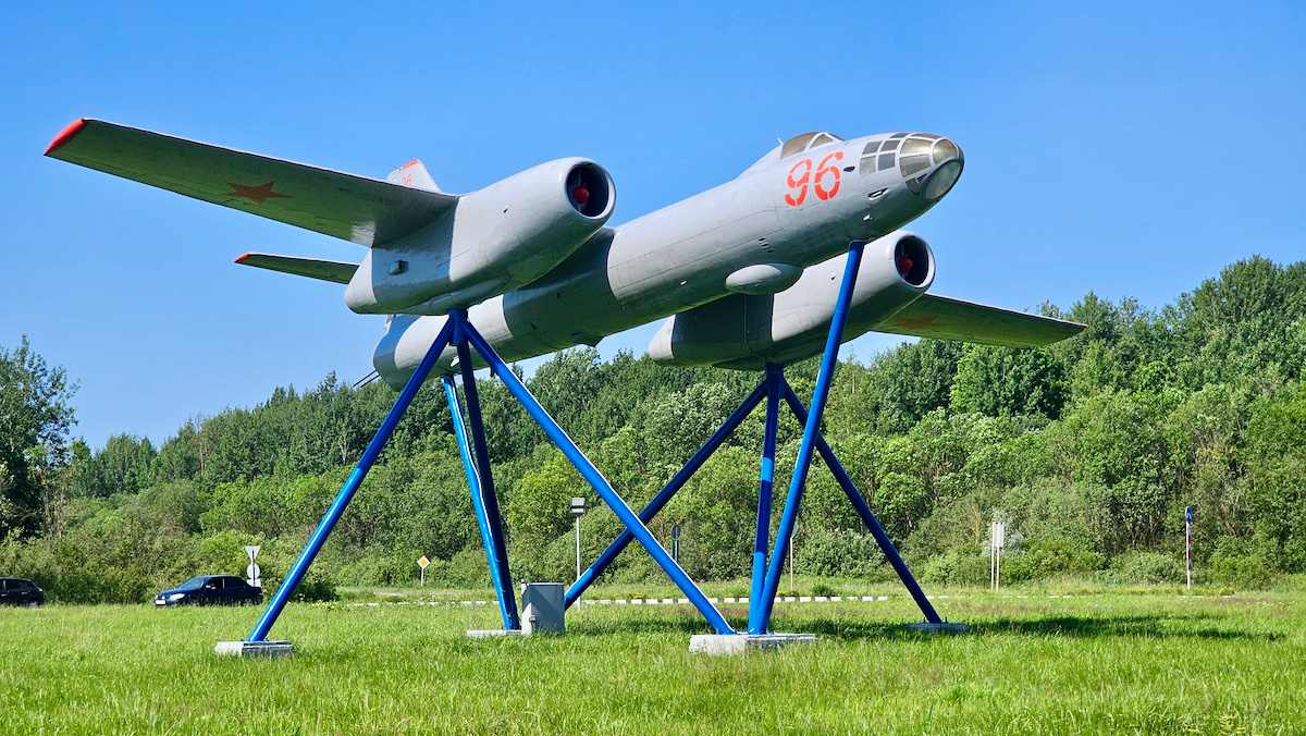 Самолет Ил-28 – «пролетает» на пересечении Лужского м Сырковского шоссе в Великом Новгороде. Спасённый от утилизации бомбардировщик обрел вторую жизнь благодаря сотрудникам предприятия «Акрон» в 2016 году. Это — группа компаний-производителей минеральных удобрений. Основное предприятие в Новгороде, основанное в 1961 году как Новгородский химкомбинат, даёт работу 1,5 % населения Новгородской области, тем самым являясь крупнейшим работодателем Новгородской области. Предприятие хорошо видно на подъезде к городу. 400 кубометров грунта было вывезено с участка, где установлен самолет, 48 кубов бетона и 7 тонн арматуры потребовалось на оборудование фундамента. 100 килограммов грунтовки и около 77 килограммов эпоксидной эмали ушло на покраску самолета. Сам самолет установлен в состоянии полета и на весьма легких опорах – уникальная конструкция, сделанная впервые в России. Гости и жители города останавливаются здесь, чтобы сделать снимок, снять видео или просто полюбоваться. А нанесенные на сам