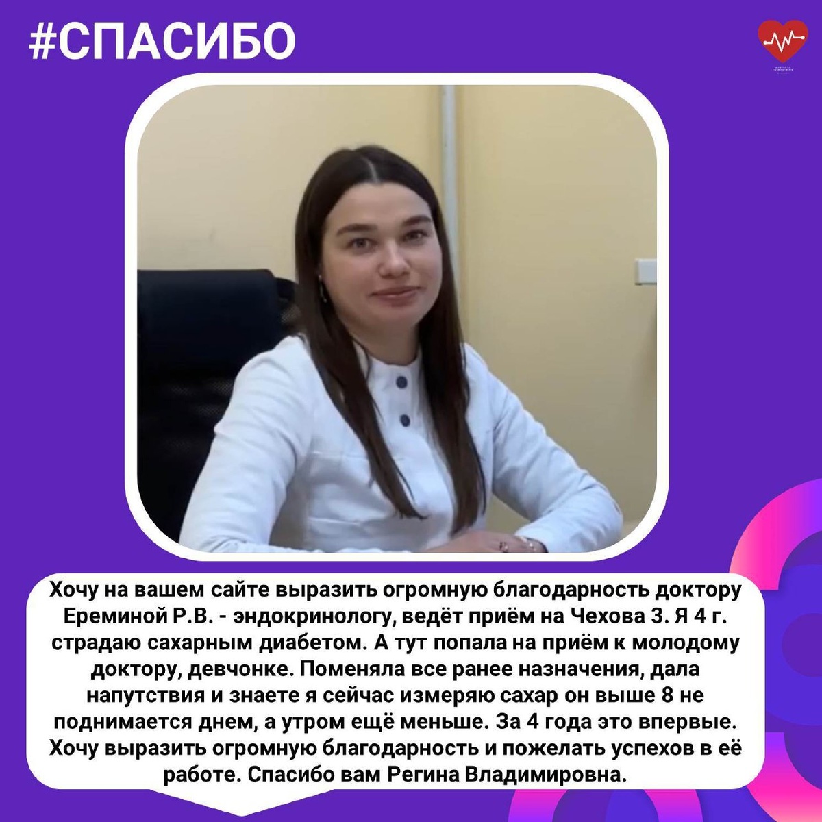 Продолжаем публиковать благодарности, которые мы получаем от пациентов. На этой неделе размещаем благодарность эндокринологу Калужской городской клинической больницы №4 им. А.С. Хлюстина. Оставить благодарность медикам можно сканируя QR-код с помощью камеры вашего смартфона. Коды находятся на кабинетах врачей в поликлиниках и стационарах.