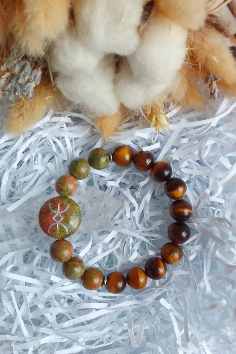 Браслет состоит из натуральных камней унакита, тигрового глаза и руны «Достаток». Русская руна «Достаток» является мощным амулетом, привлекающим в жизнь человека денежное благосостояние, а также повышая его самооценку и делая его самодостаточной личностью, наполняя её духовными знаниями. Руна «Достаток» помогает как для привлечения богатства, так и всего, о чём думает человек и в чём он нуждается: новые знания, их усвоение, расширение профессиональных навыков, здоровье, укрепление физических сил, бодрости тела и духа, любви, моральных сил для решения имеющихся проблем. Унакит считается символом гармонии, баланса и простой радости жизни. Камень, окрашенный в нежные зеленые и розовые тона, способен привнести весну в душу любого человека, наполняя её позитивом, душевным равновесием и покоем. Унакит помогает обрести внутреннюю гармонию, уравновесить психическое состояние, обрести мудрость и интуицию, находить равновесие в сложных ситуациях, а также привлекает успех, счастье и благопол