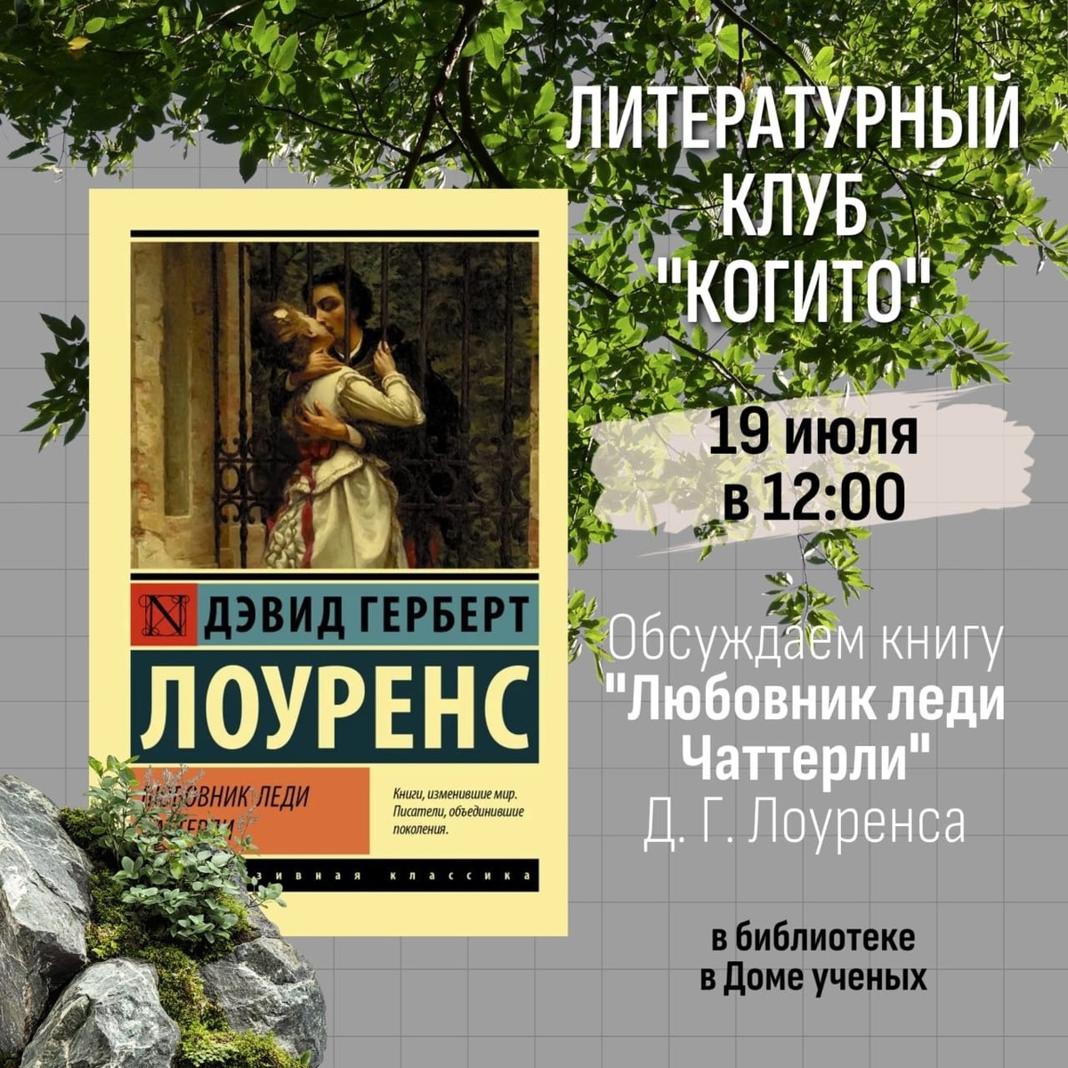📚19 июля в 12:00 в библиотеке №7 в Доме учёных состоится встреча литературного клуба «Когито». Обсуждение книги «Любовник леди Чаттерли» Дэвида Герберта Лоуренса.