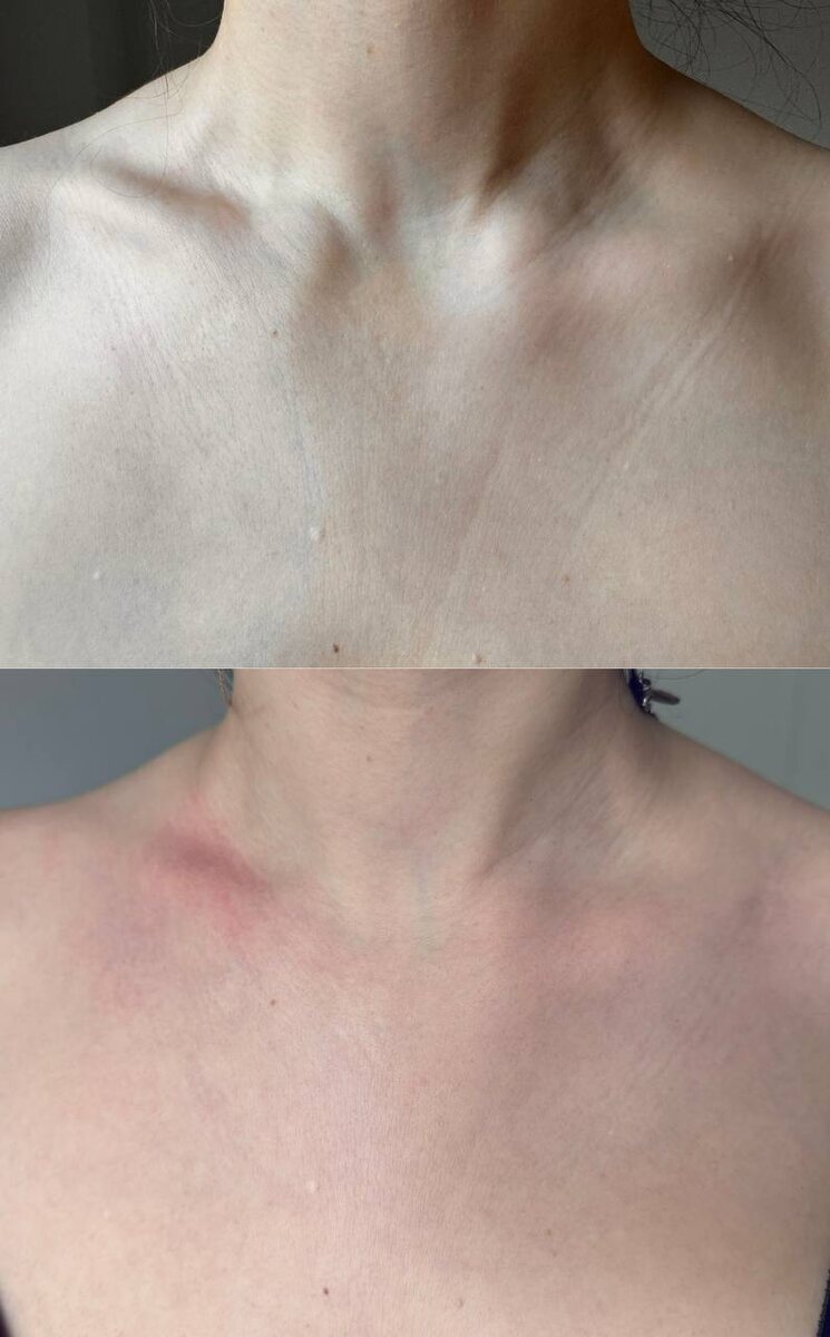 ✨ Совместная работа специалистов нашей клиники с зоной декольте ✨ Было проведено 2 процедуры биоревитализации Конаревой Асией и 1 игольчатый рф Арзамасовой Екатериной Как вам результат?)