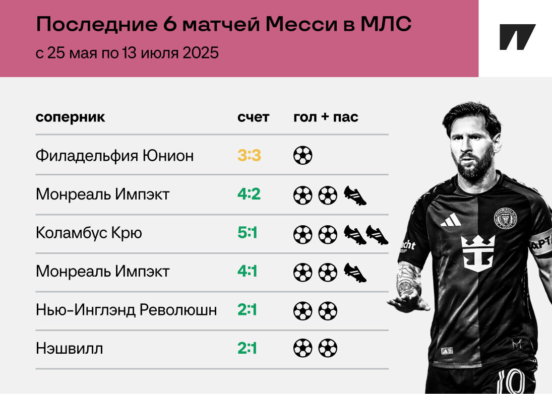 Уже лучший бомбардир МЛС. Лионель Месси в прекрасной форме: в прошлом туре капитан «Интер Майами» установил рекорд МЛС, сделав четыре дубля подряд. И вот теперь обновил собственное достижение – в матче против «Нэшвилла» (2:1) оформил пятый дубль, принеся очередную победу. А ведь на этом отрезке аргентинец еще и отдал четыре голевые! ● 11 голов за шесть туров – это повторение рекорда МЛС. Ранее такое удавалось только форварду сборной Венесуэлы Джозефу Мартинесу, который забивал за «Атланту Юнайтед» с 4 июля по 4 августа 2018 года. ● Месси уже возглавил гонку бомбардиров лиги – 16 голов в 16 матчах, ни одного мяча с пенальти. Столько же голов забил Сэм Серридж, который играет как раз за «Нэшвилл». Но у 26-летнего англичанина пять мячей с пенальти и на шесть сыгранных матчей больше. ● Лео идет вторым в МЛС по гол+пас: у него 22 результативных очка (16+6). На два голевых действия больше у форварда «Сан-Диего» Андерса Дрейера, который тоже сделал сегодня победный дубль. У экс-игрока «Рубина