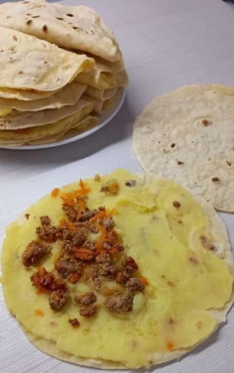 Итле кыстыбый. Камыр өчен: 100 г 15 % майлылыктагы каймак, 100 мл су, 1 йомырка, 360 г он, тоз, чәй содасы. Эчлек өчен: бәрәңге боламыгы, фарш, суган, кишер, лавр яфрагы, тоз, томат пастасы. Камыр басып, 15 минут тотарга. Бу камырдан 14 җәем чыга. Җәемнәрне коры табада ике ягын да кыздырырга һәм тастымал каплап куярга. Бәрәңге боламыгы әзерләргә. Табада фаршны, угычтан уылган кишер, вак итеп туралган суган, томат пастасы, тоз һәм лавр яфрагын томалап пешерергә. Җәемнең бер ягына боламык, икенче ягына итле эчлекне салырга. Урталай капларга. Кыстыбыйларны эретелгән атланмай белән майларга. Гөлия БАЛТИНА, Чыганак