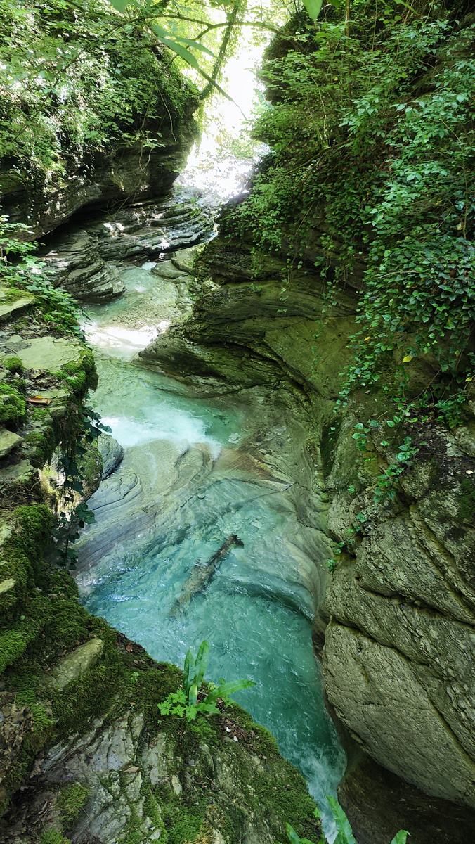 То нам все эти скобы и тросы ни к чему, и дойдя до первого же сужения каньона где вода просто сводила с ума своей глубиной и цветом, мы занырнули в ледяные объятия реки. Вода на контрасте была настолько холодная, что у меня даже перехватило дыхание, и я даже не помню, как проплыла эти первые пять метров.