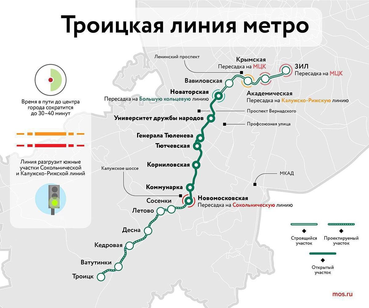 Метро в Троицке⚡️ Названы сроки, в которые подземка доберется до Троицка. И это произойдет до 2030 года. Информация появилась на официальном портале мэра Москвы. ➡️ Все 17 станций Троицкой линии собираются ввести до 2030 года, ее общая протяженность составит 43,3 км. ➡️ Уже функционируют станции «Новаторская», «Университет дружбы народов», «Генерала Тюленева», «Тютчевская», «Корниловская», «Коммунарка» и «Новомосковская». ➡️ В стадии строительства — участок от «Новаторской» до станции «ЗИЛ», в стадии проектирования — «Сосенки», «Летово», «Десна», «Кедровая», «Ватутинки» и «Троицк».