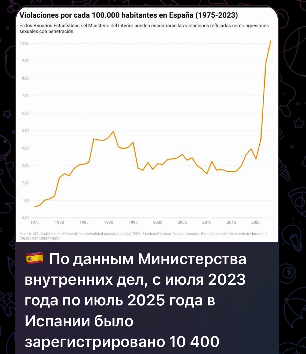 🇪🇸 По данным Министерства внутренних дел, с июля 2023 года по июль 2025 года в Испании было зарегистрировано 10 400 изнасилований. Девяносто процентов жертв — женщины.