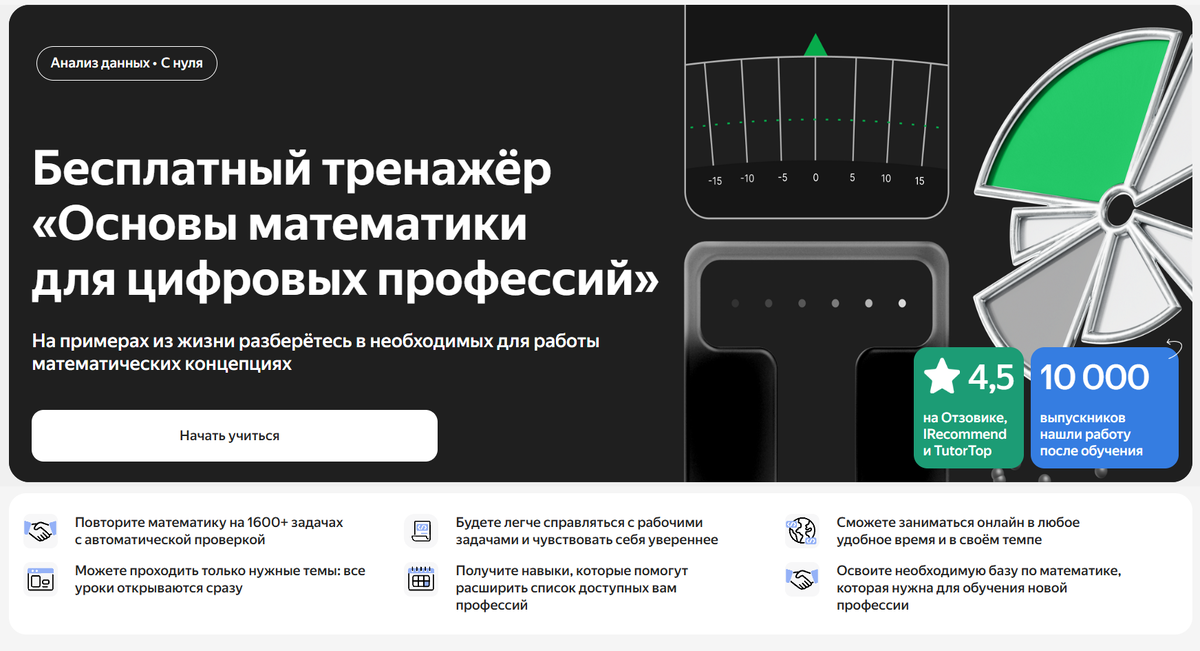 В программу включены модули по линейной алгебре, теории вероятностей, математической статистике и численным методам. Примеры — из финансов, медицины, онлайн-сервисов. Формат гибкий: можно учиться с любого устройства. Преподаватели — практикующие аналитики. Есть проверка заданий и обратная связь. По итогу — чёткое понимание, зачем и как используется математика в задачах Data Science.