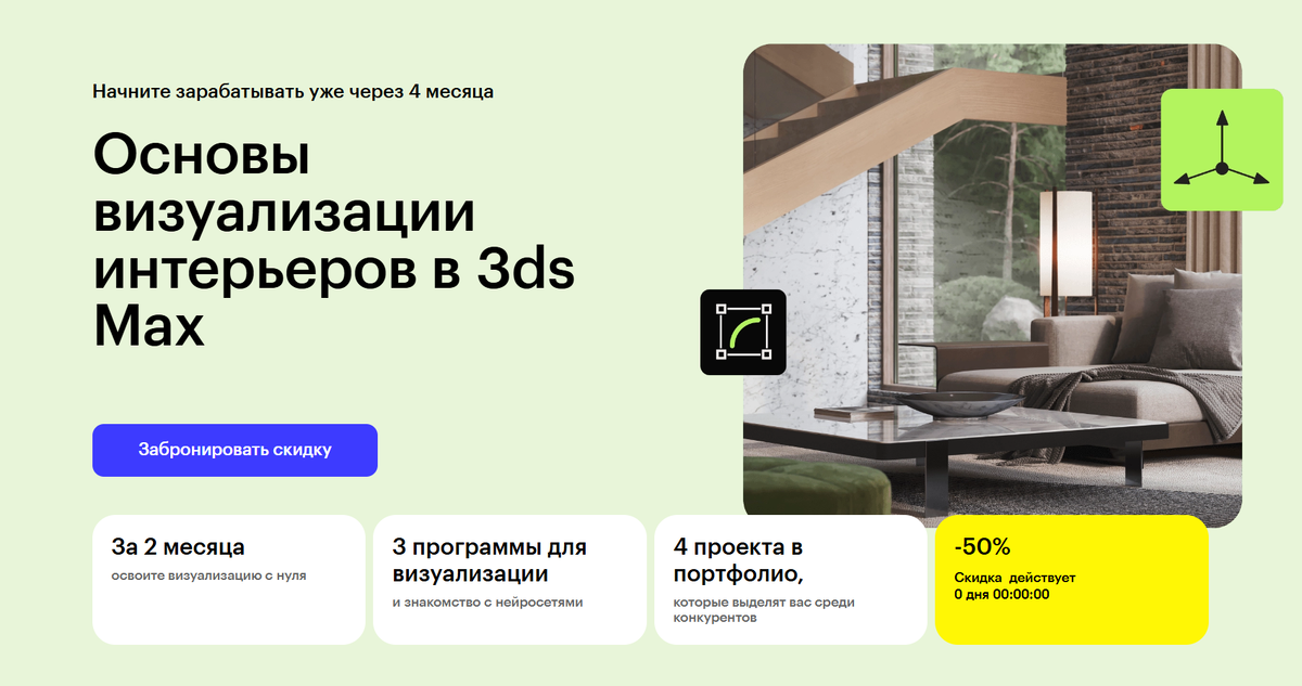 Программа подходит новичкам без опыта в дизайне и моделировании. В курсе много практики, понятный темп и подробные пояснения. Преподаватели — действующие визуализаторы. В итоге участники собирают собственное портфолио, получают навык работы в коммерческих проектах и понимают, как презентовать результат клиенту.