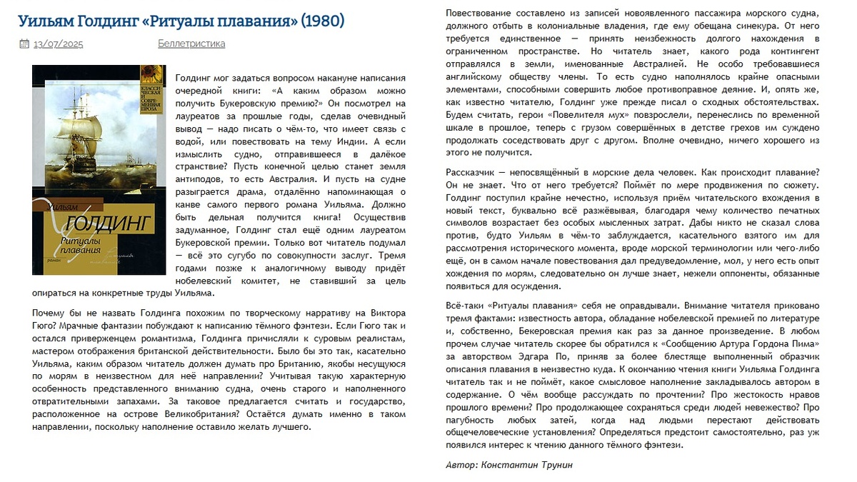 Уильям Голдинг "Ритуалы плавания" (1980) | Критика