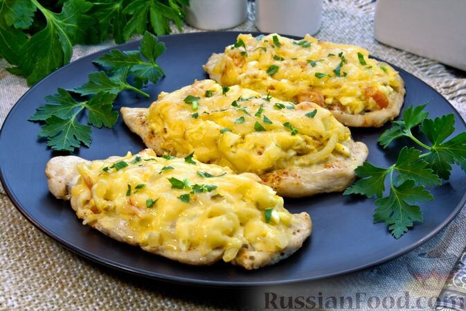 Куриные отбивные, запечённые с варёными яйцами, помидорами и сыром. Отбивные из куриного филе в соевом кляре. Куриные отбивные, запечённые с творогом, сыром и помидорами. Отбивные из свинины, запечённые с грибами и помидорами. Отбивные из куриного филе в соевом кляре. Благодаря соевому соусу корочка на отбивных приобретает не только специфические вкусовые нотки, но и красивый карамельный цвет. Куриные отбивные быстро готовятся и получаются сочными и мягенькими. Куриные отбивные, запечённые с творогом, сыром и помидорами. Сочетание творога и куриного мяса несколько необычное, но довольно удачное и вкусное. Отбивные получаются мягкими, нежными, с румяной сырной корочкой. Отбивные из свинины, запечённые с грибами и помидорами. Мягкие отбивные из свинины дополняются ароматными грибами, тушенными со сливками, сочными помидорами и моцареллой и запекаются в духовке. Благодаря сливкам блюдо получается особенно нежным, помидоры добавляют кислинку, а грибы обеспечивают аппетитный аромат. Курины