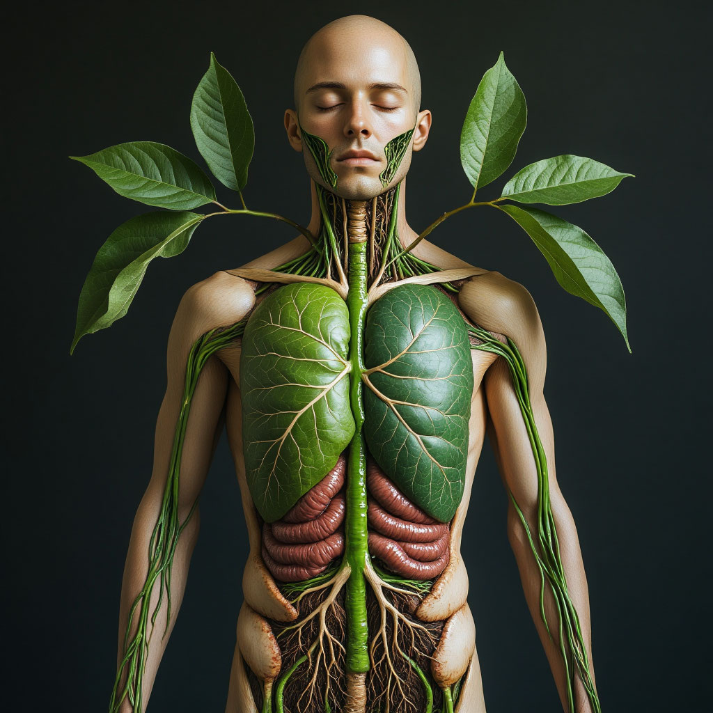 На первый взгляд, растения и люди кажутся абсолютно разными формами жизни!? Не так ли? Сходства между растениями и человеком гораздо глубже, чем кажется на первый взгляд. Природа, словно талантливый архитектор, создала удивительные аналогии в их строении и функциях. Здравствуйте, дорогие читатели! Меня зовут Настя, и я рада приветствовать Вас на странице этой статьи. Я хочу поделиться с Вами своим подходом к выращиванию и уходу за комнатными растениями. Я уверена, что у каждого из нас есть свой уникальный взгляд по уходу за растениями, и я надеюсь, что мои статьи станут поводом для интересных обсуждений и новых идей. Давайте совершим путешествие в мир биологических параллелей, где корни растений напоминают кишечник человека, а листья — легкие, и откроем для себя, как жизнь решает одни и те же задачи разными путями. Спасибо за внимание, и приятного чтения! ❗Все картинки сгенерировала Алиса ❗ Корневая система растений выполняет ту же роль, что и пищеварительная система че