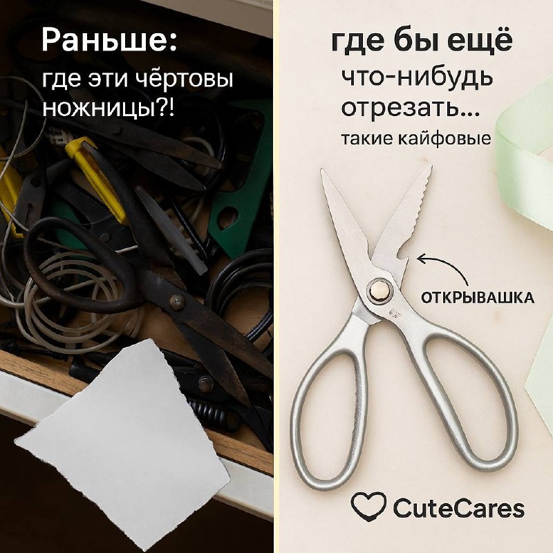 ✂️ Раньше: “Где эти чёртовы ножницы?!” Теперь: “Где бы ещё что-нибудь отрезать... Такие кайфовые!” Когда вещь просто работает и радует — это любовь с первого разреза 💘 📦 Ножницы для дома — артикул WW122811 Удобные, острые и стильные. Больше никаких “грызущих” лезвий CUTECARES | WB | официальный сайт CUTECARES | наши соц.сети