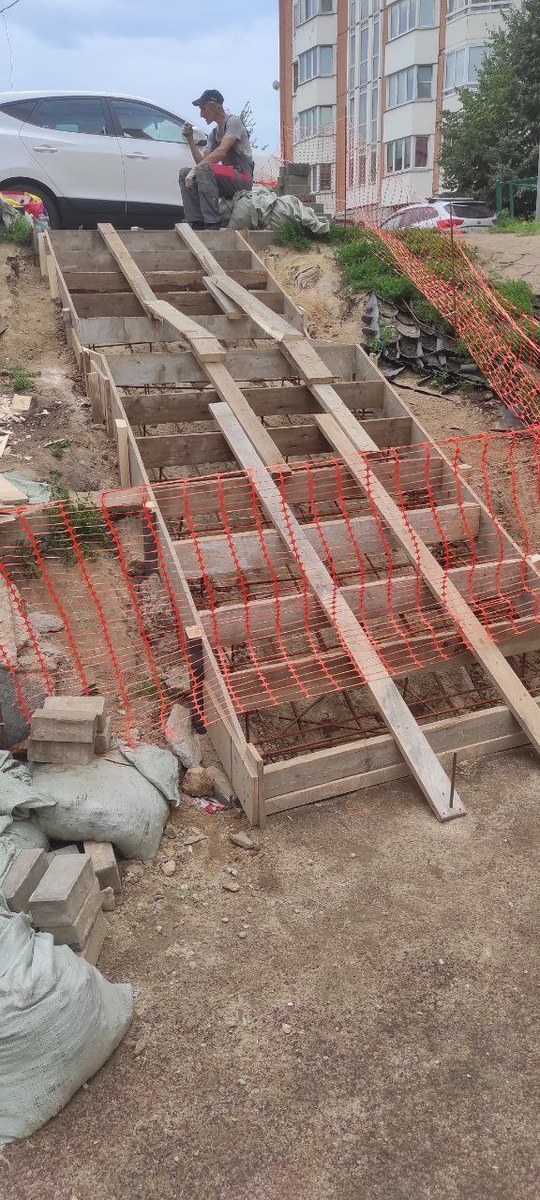 Возле Южной, 25, уже сделали опалубку и связали арматуру. Скоро будут заливать бетон, и лестница будет готова!
