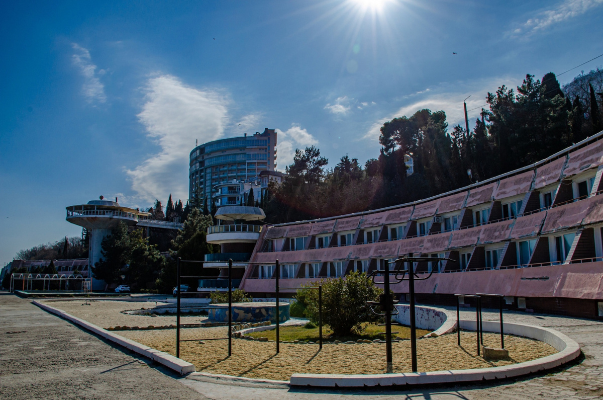 экспериментальный подход. Использование простых отделочных материалов также соответствует советской курортной архитектуре того периода. Здание пансионата воплощено в форме двух симметричных волн, словно "отступающих" от моря, что создает эффект динамичного движения. Этот художественный замысел не только отсылает к морской тематике, но и гармонично интегрирует строение в прибрежный ландшафт. Центром композиции служит цилиндрическая башня, напоминающая маяк, где размещается ресепшн. Эта доминанта объединяет дв