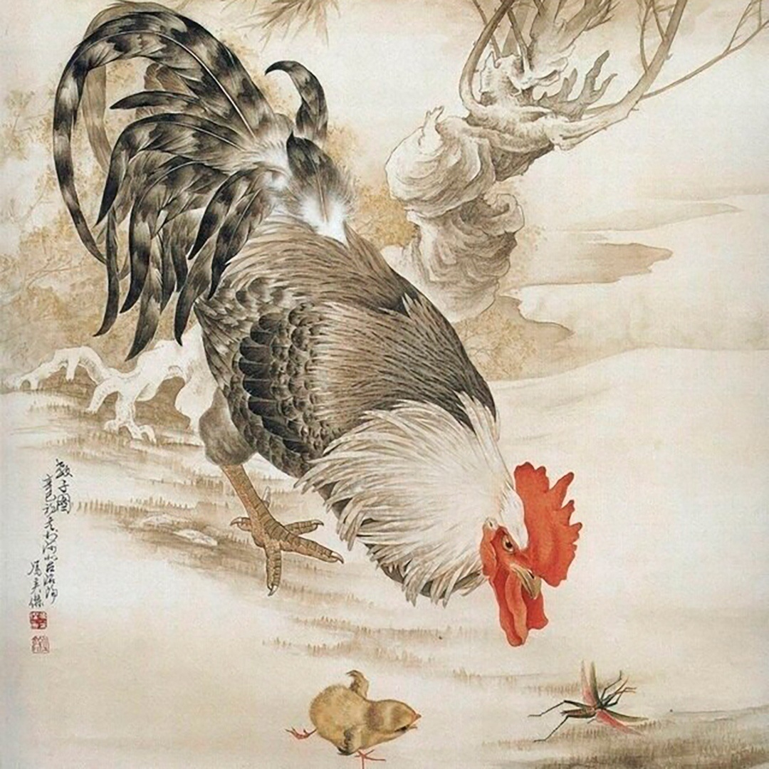В произведениях Фэн Инцзе, работающего в стиле гохуа, петухи получили особое почетное место. Этот выбор далеко не случаен — художник глубоко понимает символическое значение этой птицы в китайской культуре.
