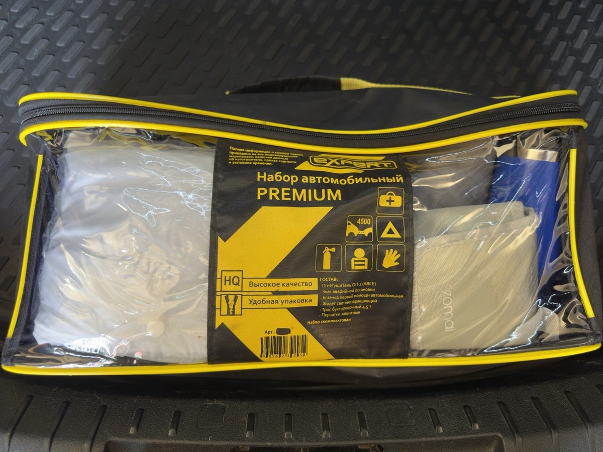 Выбор сумки для нашего тревожного чемоданчика в машину пал на практически случайно приобретенный обычный автомобильный комплект, которые продаются почти везде. Неоспоримым его плюсом стало то, что у него одна из стенок прозрачная, вопрос поиска вещей в темное время суток слегка упроститься.