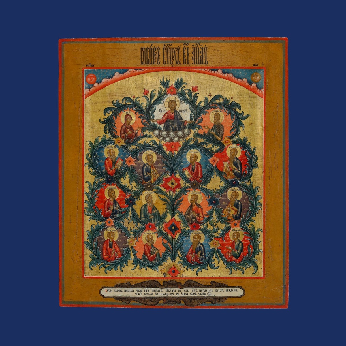 13 июля – Собор двенадцати апостолов Сегодня чествуют двенадцать учеников Христа, которые оставили свою прежнюю жизнь и последовали за ним. Они стали посланниками Господа: проповедовали его Слово во всех концах земли, терпели лишения и страдания. Все апостолы, кроме Иоанна Богослова, приняли мученическую смертью за свою веру. Рассказываем об иконе, где двенадцать апостолов изображены вместе. Образ с необычной композицией Изначально ближайших учеников Христа на иконах просто размещали рядами или по сторонам от Спасителя – как на групповом портрете. Позже возник более сложный вариант – как раз как на иконе из нашего собрания: 🔹Через всю композицию тянется цветущая лоза. Ее завитки образуют «рамки», в которых размещаются персонажи: 🔹Наверху в центре Христос, который благословляет двумя руками. По сторонам от него Богоматерь и Иоанн Предтеча в молитвенном заступничестве за все человечество. 🔹Ниже – двенадцать апостолов, каждый в своей «рамке» из растительных завитков. Как можн
