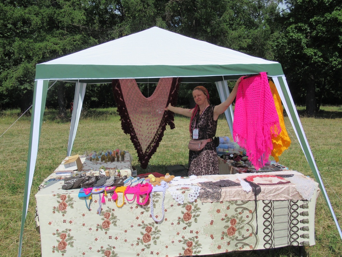 Приветствую Всех!!! 12 июля в селе Ветошкино Гагинского района проходила Тихвинская ярмарка. Это молодое мероприятие проводят второй раз, в прошлом году нам поучаствовать не посчастливилось, а в этот раз, к нашей радости, мы всё таки туда попали. Почему Тихвинская, если в Ветошкино? Престольный праздник в Ветошкино - день Тихвинской иконы Богородицы, вот в честь иконы и ярмарка Тихвинская. Единственным минусом этой ярмарки стали погодные условия - аномальная жара, просто пекло какое то. Благо мероприятие проходило в парке и часть площади прикрывали деревья, создавая уютную тень, в дополнение был установлен распылитель постоянно разбрызгивавший воду, можно было охладиться под ним. Вот такой шикарный шатёр и два стола было предоставлено организаторами ярмарки прибывшим ремесленникам. Была представлена богатая концертная программа, выступали артисты и коллективы со всего района и не только... Был, например, очень заводной коллектив из Пильны. Справа за динамиком, на фоне иконы, спр