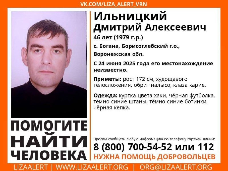 Внимание! Помогите найти человека! Пропал #Ильницкий Дмитрий Алексеевич, 46 лет. с. #Богана, #Борисоглебский г.о., #Воронежская обл. С 24 июня 2025 года его местонахождение неизвестно. Если вы обладаете какой-либо информацией о пропавшем, просьба позвонить по номеру телефона горячей линии отряда 88007005452 (бесплатно по РФ) или в 112. ⚡️Подпишись на «Медиа-Х Воронеж»