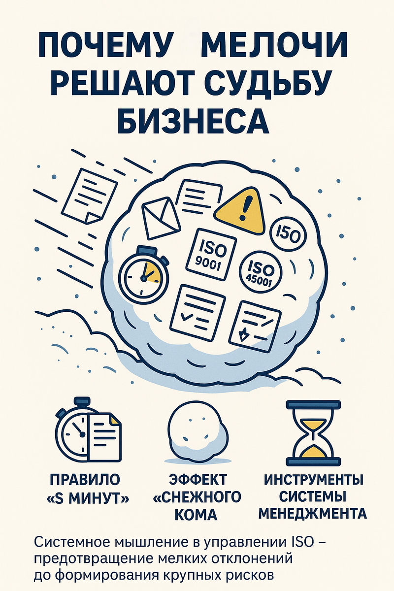 В практике консалтинга по ISO мы регулярно сталкиваемся с ситуациями, когда отсутствие реакции на мелкие отклонения приводит к серьезным последствиям. Отклонение в сроках, неотвеченное письмо, устаревший шаблон документа — всё это кажется незначительным. Но именно из таких «мелочей» складываются убытки, претензии, потери клиентов и штрафы. 🔧 Правило 5 минут — база системного мышления Если задача решается за 5 минут — выполните её немедленно. Это простое правило помогает избежать накопления управленческих "хвостов". Примеры из нашей практики: При внедрении ISO 9001 клиент вовремя отреагировал на замечание аудитора — это позволило избежать несоответствия 1 категории. На производстве был замечен отклоняющийся тренд в показателях ОТ — немедленные действия предотвратили инцидент. Обращение контрагента обработано в течение дня — клиент остался в контракте, не ушёл к конкуренту. 📌 В системах менеджмента качество зависит не только от процедур, но и от скорости их исполнения. ❄️ Эффект “снеж