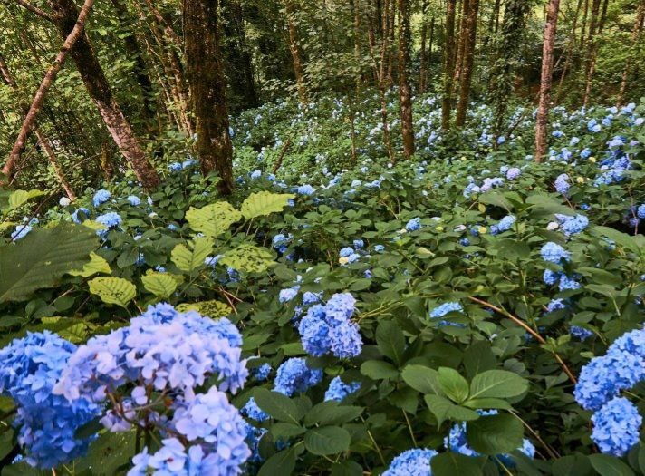На фоне лазурного неба и величественных гор, местность выглядит сказочно-фантастической. К тому же сейчас здесь цветут шикарные яркие гортензии. Виды потрясающие!