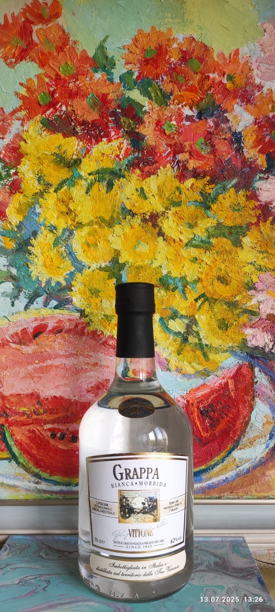 Всем привет от меня, КОньячного Маньяка и наших друзей! Давно мозолила мне глаза эта граппа в Магните. И цена приемлемая, по скидке 1100р, и по виду чисто Италия, да в инете инфы никакой, как про херес Пицарро. Стало быть, типичный спецрозлив для Магнита. Стремновато брать такой после не оправдавшей в прошлый раз ожиданий Luxardo Euganea. Но пробовать то надо! Вот и решился таки взять на почти добежавшие до суммы донаты. Пробую! Водка виноградная Граппа. Год урожая 2022, розлив 11.2023. Сорта винограда: Пино Гриджио, Просекко, Риболла, Джалла (намешали, однако, знатно). Изготовитель Полини Груп, Италия. Также вполне себе известный бренд. Пробка винтовая, с дозатором! Пустячок, а приятно. А дома то +30. И естественно, пошёл не аромат, а ароматище. Но в бокале аромат тонкий, очень нежный, особенно для граппы, буквально как цветочный. Сладкий виноград кишмиш, кожица винограда, листья, душистые травы, полевые цветы. И никаких косточек либо мезги! Пожалуй, самая нежная по аромату белая грап