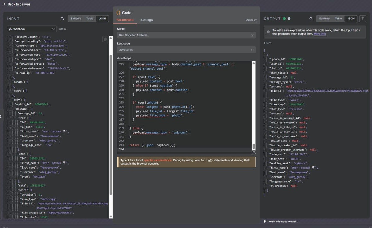🚀 КАК ПОДКЛЮЧИТЬ ТЕЛЕГРАМ-БОТ К СЕРВИСУ Давай разберемся, зачем это нужно вообще и какие дает преимущества. По факту, ты можно арендовать сервер за 300-500 рублей в месяц, установить на него бесплатно сервис n8n и получить безлимитный конструктор чат-ботов - и по количеству подключённых чат-ботов, и по количеству подписчиков. Да, это чуть профессиональнее и технически сложнее, но зато получаем широкую гибкость. Можем работать как с ботами, так и с чатами, каналами, и ботами в личных аккаунтах. Итак, чтоб подключить Телеграм к n8n, следуем этому плану: 1. Создаем узел Webhook, настраиваем его на принятие POST-запросов, и копируем ссылку. 2. Далее подключаем эту ссылку к Телеграм, для этого нужно вставить свои данные в ссылку и открыть ее в браузере (ссылку приложу ниже). 3. Проверяем, как работает, отслеживаем в логах работоспособность. В принципе, все, но есть еще интересная наработка - унификация всех запросов от Телеграм. Дело в том, что каждое событие от пользователя - при