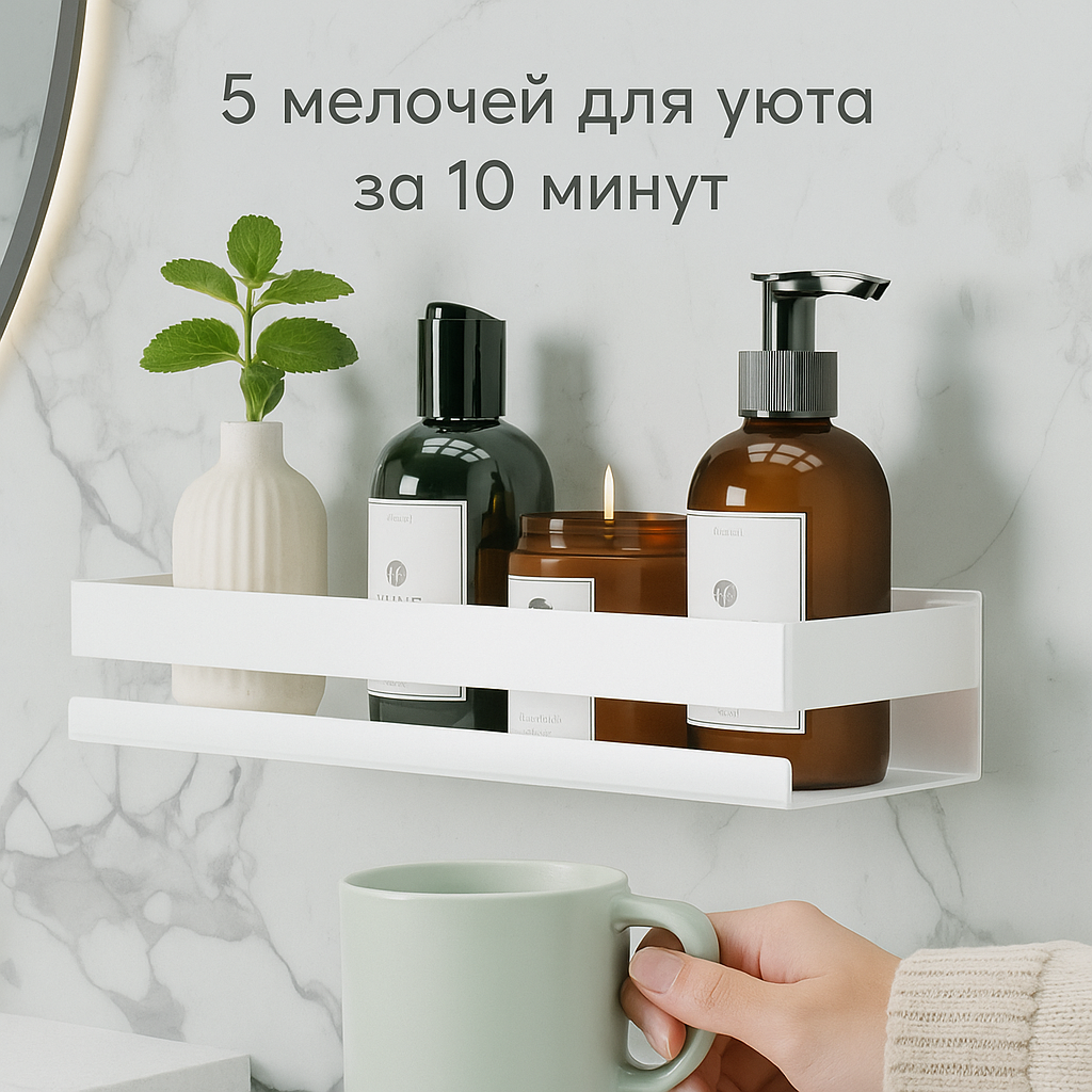 И вроде ничего не нужно делать, но внутри зудит: «Хочется уюта. Хочется, чтобы красиво». Но вот хорошая новость — чтобы стало приятно и тепло в доме, не нужно затевать генеральную уборку или переклеивать обои. Иногда достаточно пары простых шагов. Я делаю их почти каждый выходной — и эффект ощущается моментально. Делюсь с вами: Без сверления, без лишней суеты. Просто приклеила — и всё: кремы, свечи, баночки больше не кочуют по стиралке.