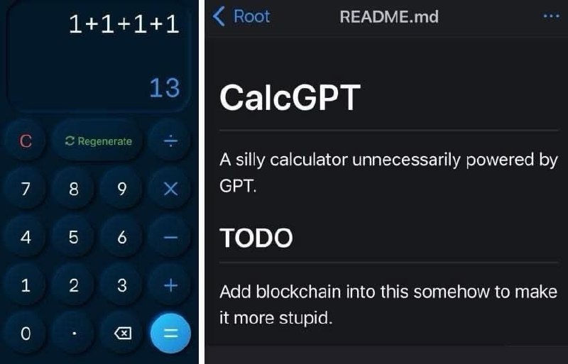 Чел сделал самый бесполезный калькулятор в мире — на GPT-3. Он принципиально считает всё неправильно, включая 1+1, и с гордостью этим пользуется. Автор обещает добавить блокчейн, чтобы стало «совсем умно». Осталось залить в корпус жидкое стекло и ждать инвесторов.