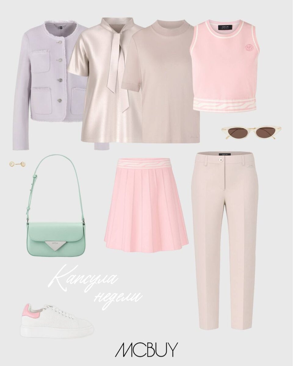 Капсула недели 💖 На этой неделе — пудрово-розовая гамма, сливочные и лавандовые акценты. Они создают лёгкое, воздушное настроение, идеально подходящее для городского лета. Капсула включает как женственные образы с акцентом на силуэт — благодаря юбке и лаконичным брюкам, — так и расслабленные, но изысканные топы и жакет. Ссылки на товары: - жакет из шерсти; - блуза из шёлка; - пуловер из хлопка; - топ из вискозы; - теннисная юбка; - брюки со стрелками; - текстильные кеды; - сумка с логотипом Все позиции доступны на сайте mcbuy.ru и в бутиках в Москве и Санкт-Петербурге.