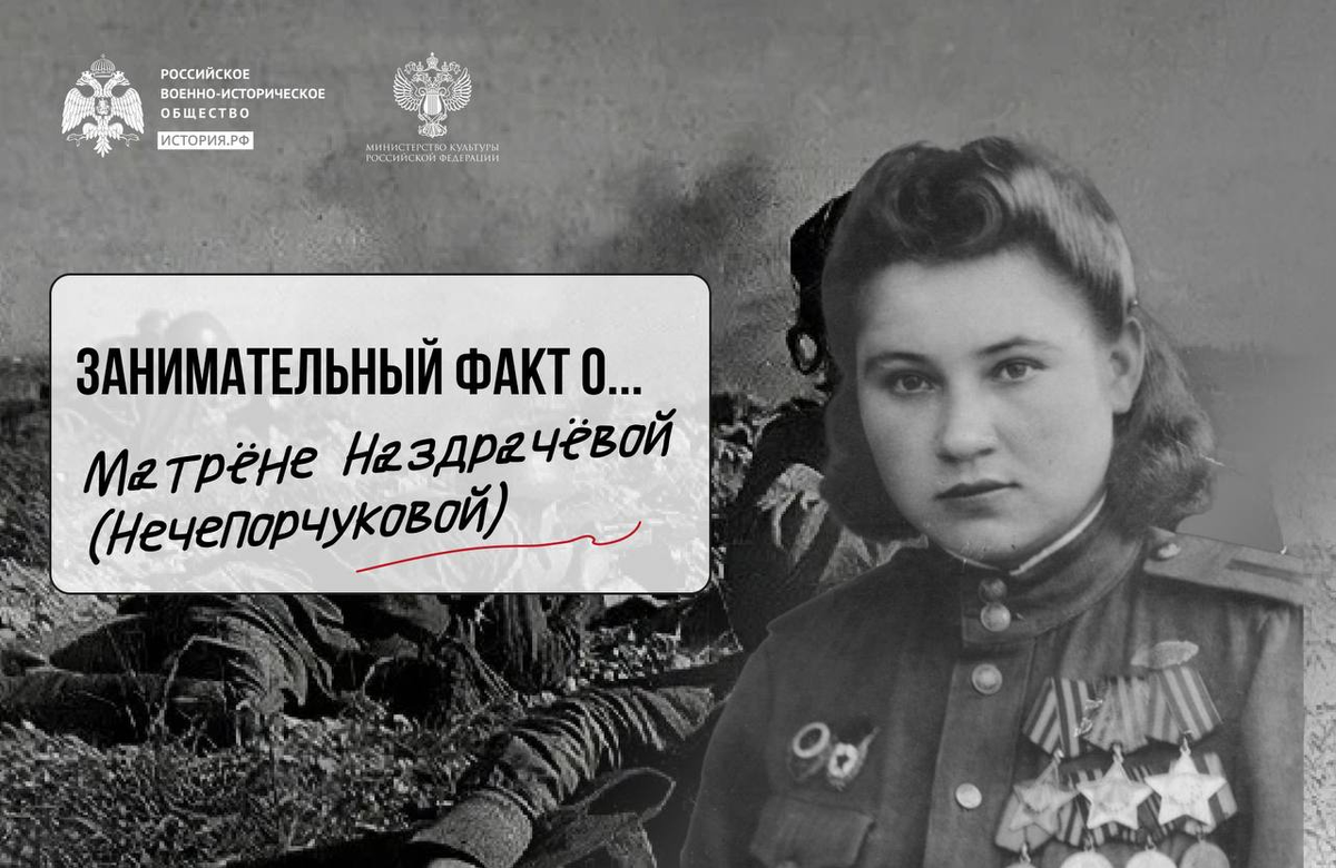 Санинструктор Матрена Нечепорчукова за весь период Великой Отечественной войны спасла более 250 жизней. Солдаты и офицеры называли Матрёну Семеновну «Ласковые руки». Она запечатлена на картине известного военного художника Виктора Климашина. Работа была опубликована в февральском номере журнала «Огонёк» за 1946 год. Больше занимательных фактов о героине войны читайте на портале История.РФ