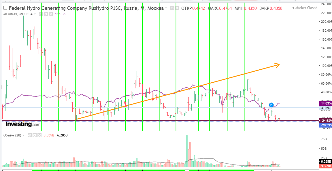 Я только что удачно отторговал преддивидендный аптренд в RTKM_p (54-61) и, сытый и довольный, стал оглядываться по сторонам. А по сторонам ничего уже и не осталось: преддивидендная весна бурного роста всего на Мамбе завершилась. Все податели дивидендов, готовые и желающие их подать - уже предложились, утвердились, объявились и отросли. Осталась только непонятная ситуация с Русгидро (HYDR). С 2013 акция находится в стратегическом боковике. Никакой речи о том, что цена впитывает инфляцию - быть не может (традиционно инфляция 2013-2025 красной стрелой). Сейчас Русгидро стоит столько же, сколько и в 2013, но инфляция дала +135%. По другому - акция в реальности подешевела в в 2,35 раза. А вот графики HYDR и RGBI (синяя линия) очень даже сопоставимы. Не очень-то и заметны кризисы 2020 и 2022. Что наводит на мысль о том, что пред нами квазиоблигация типа RTKM. Как видите, они и торгуются достаточно похоже. Торгуется гидрогенерация практически параллельно с тепловой генерацией и сетями - ч