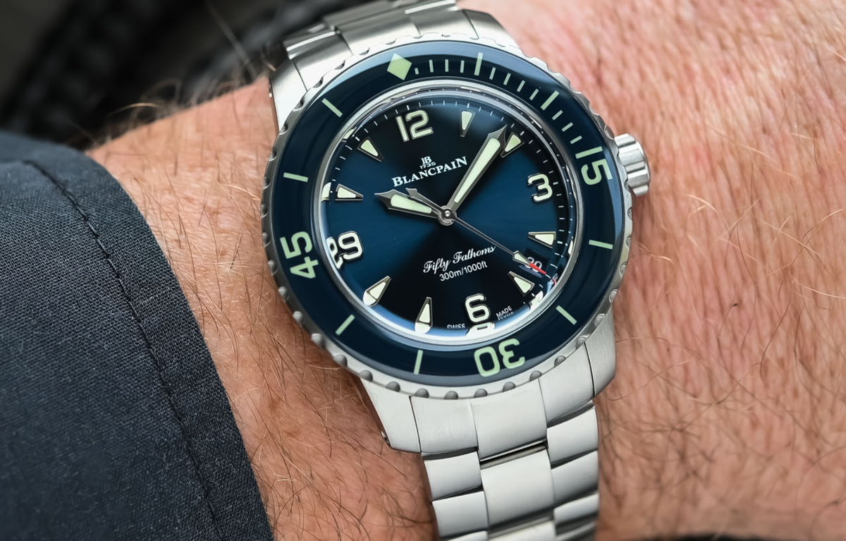 Еще одни культовые дайверские часы, которые недавно стали доступны в уменьшенном размере — Blancpain Fifty Fathoms. Модель выпускается в корпусах из нержавеющей стали, титана или красного золота 18 карат. Сохраняется классический стиль и пропорции, которые сделали Fifty Fathoms легендой. Циферблат доступен в синем или черном цвете с солнечной шлифовкой, а безель украшен сапфировой вставкой. Калибр 1150 обеспечивает внушительный запас хода до 100 часов благодаря конструкции с двумя барабанами. В зависимости от материала корпуса часы комплектуются трехзвенным браслетом, резиновым ремешком Tropic или текстильным NATO-ремешком. Цена варьируется от 14 000 до 28 500 швейцарских франков.