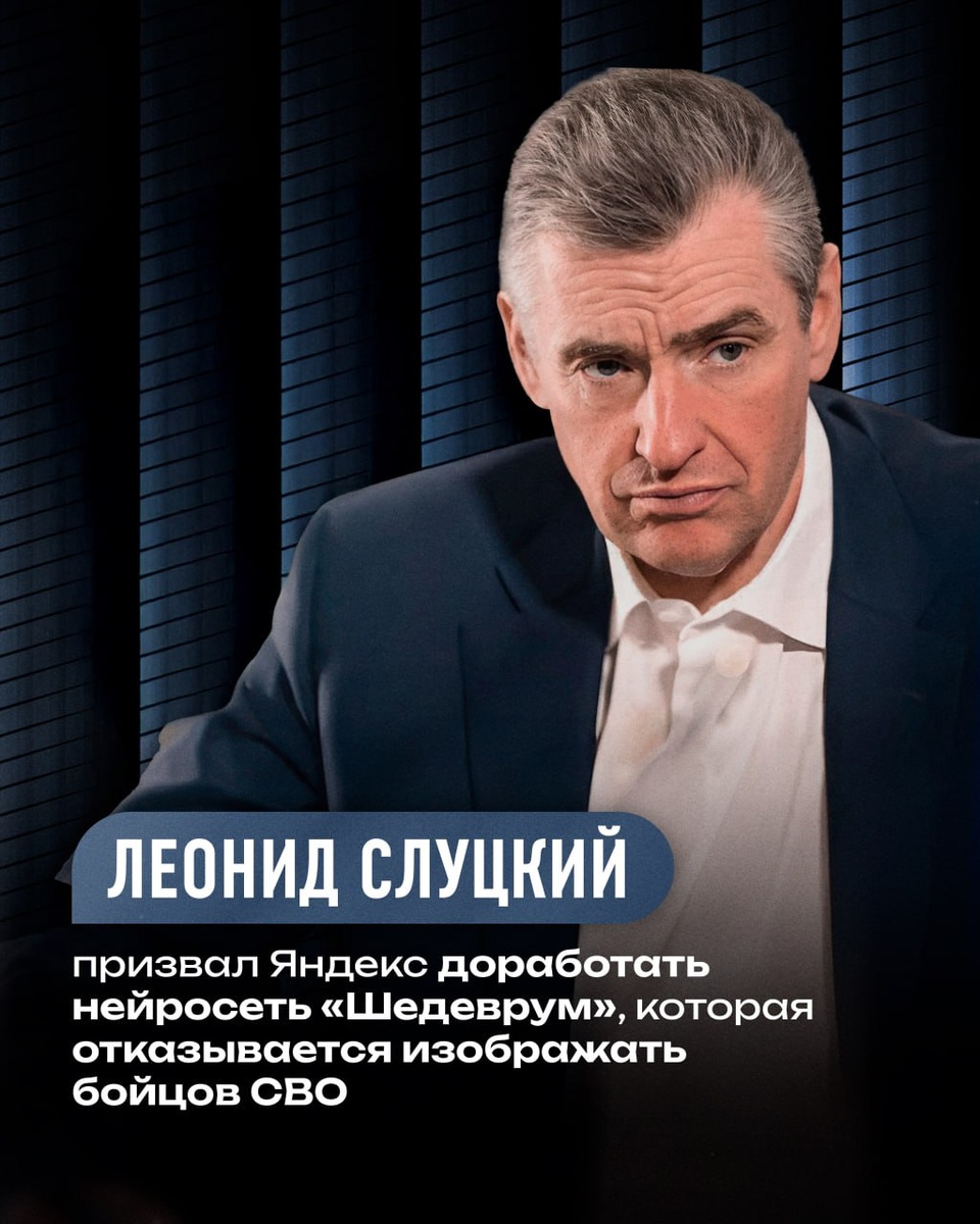 ЛДПР предложила Яндексу создать рабочую группу по доработке нейросети «Шедеврум» 🔝 Соответсвующее письмо Председатель ЛДПР Леонид Слуцкий направил в адрес компании, в котором также предложил привлечь к донастройке алгоритмов сервиса отраслевых экспертов. ➡️ Леонид Слуцкий отметил, что важно исключить искажения исторических и патриотических образов, особенно в сервисах, ориентированных на широкую молодежную аудиторию. ➡️ Ранее молодежная организация ЛДПР обнаружила, что Нейросеть «Шедеврум», входящая в экосистему «Яндекса», по запросу о российском космонавте генерирует изображение американца с флагом США, а попытка изобразить участника СВО блокируется как якобы нарушающая правила. Дорогие подписчики, благодарим Вас за поддержку! Ваши реакции, приглашения друзей и репосты позволяют нам развиваться. Не забывайте ставить 👍👍👍